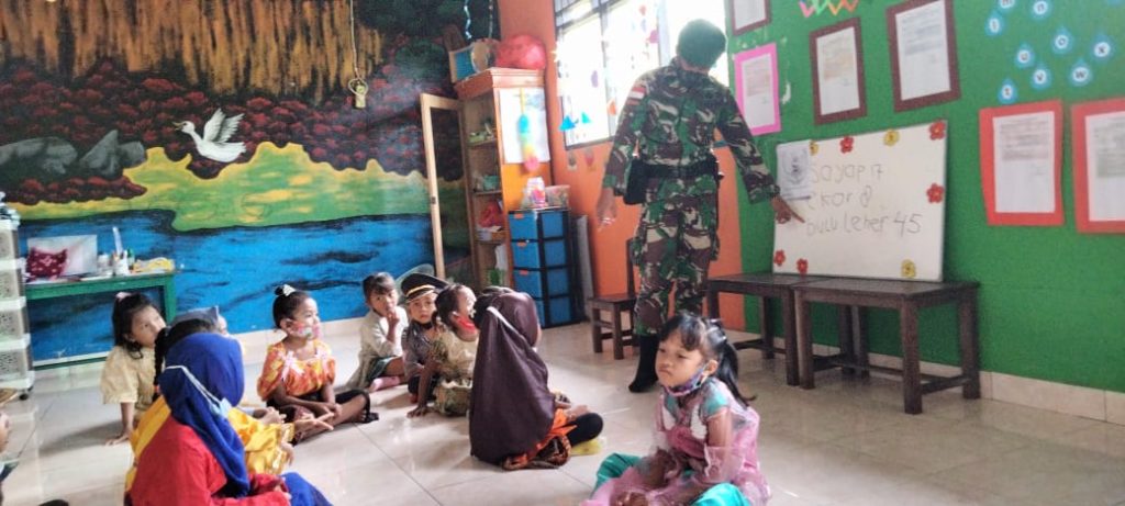 Keerom – Dalam rangka memperingati hari Kartini yang jatuh pada tanggal 21 April, Satgas Pamtas RI-PNG Yonif Mekanis 512/QY Pos Arso XIII mengajak para murid untuk menggunakan pakaian adat di taman kanak-kanak (TK) Tunas Harapan di Kampung Naramben, Distrik Skanto, Kabupaten Kerom, Papua. Rabu (21/04/2021)