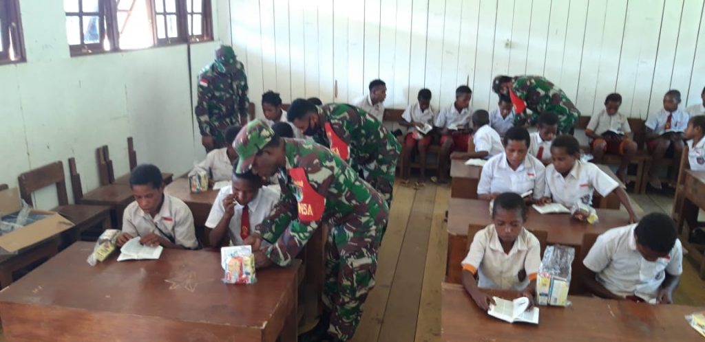 Pada kesempatan siang itu dengan suasana yang terik dan perjalanan yang panjang, para Babinsa Koramil 1715-01/Oksibil dengan dipimpin Kapten Cba Dwi Wawan.H selaku Danramil 1715-01/Oksibil menyerbu sebuah Sekolah Dasar yang bisa di katakan jauh dari standart mutu, aksi ini dilakukan untuk melakukan interaksi secara langsung dengan siswa siswi SD Katobapib demi menciptakan suka cita bahagia untuk generasi penerus bangsa tersebut, moment interaksi dengan siswa siswi ini dilakukan dengan berbagi kasih berupa pemberian batuan 100 alkitab, 50 tas sekolah. Dalam kegiatan tersebut di awali dengan edukasi protokol kesehatan tentang bagaimana menerapkan hidup sehat dengan mematuhi protokol kesehatan 3 M (Menjaga jarak, Memakai masker dan Mencuci tangan) agar terhindar dari virus Covid19, dan kegiatan di akhiri dengan pemberian bantuan 2 karton Handsanitiser serta 50 masker.