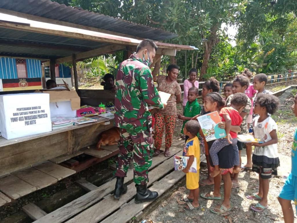 Keerom – Dalam rangka meningkatkan minat belajar dan membaca anak-anak di perbatasan, Pos Kotis Satgas Pamtas Yonif 403/Wirasada Pratista membagikan buku dan alat tulis gratis kepada anak-anak di Kampung Senggi, Distrik Senggi, Kabupaten Keerom, Papua. Sabtu, (17/04/2021).