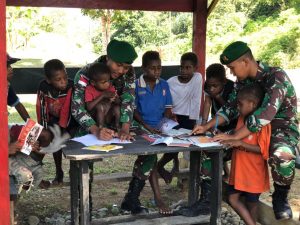 Oksibil – Dalam rangka meningkatkan rasa nasionalisme para pelajar, Personil Poskoki Oksibil Satgas Pamtas Yonif 403/Wirasada Pratista melatih anak-anak usia...
