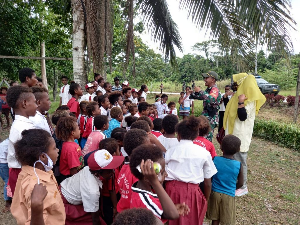 Keerom – Mematangkan perkembangan jiwa sosial anak-anak Papua, Satgas Pamtas Yonif 131/Brs Pos Mosso laksanakan pembelajaran melalui permainan edukatif kepada anak-anak sekolah Paud Florencia dan SD di wilayah Kampung Mosso Distrik Muara Tami Jayapura.(14/06/2021)