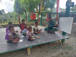 Keerom - Dalam upaya membangkitkan semangat anak-anak untuk belajar, anggota Pos Kalilapar Satgas Pamtas RI-PNG Yonif Mekanis 512/QY mengajarkan cara...
