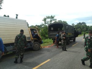 Keerom - Satgas Pamtas Yonif 403/Wirasada Pratista Pos Kout membantu evakuasi mobil truk yang nyaris terbalik karena terperosok kedalam parit...