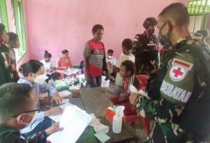 Keerom - Dokter Satgas Pamtas RI-PNG Yonif Mekanis 512/QY Lettu Ckm Dr. M. Efendi Nugraha Hasibuan bersama dengan anggota kesehatan...