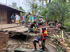 Keerom - Prajurit TNI Satgas Pamtas Yonif 131/Brs Pos Kali Asin di bawah pimpinan Letda Inf Daniel membantu perbaikan rumah...