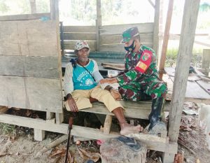 Keerom - Serda Andik Purnomo Babinsa Koramil 1701-23/Skanto melaksanakan Komunikasi Sosial (Komsos) dengan tokoh masyarakat Bapak Markus Mungguai (65 th), ...