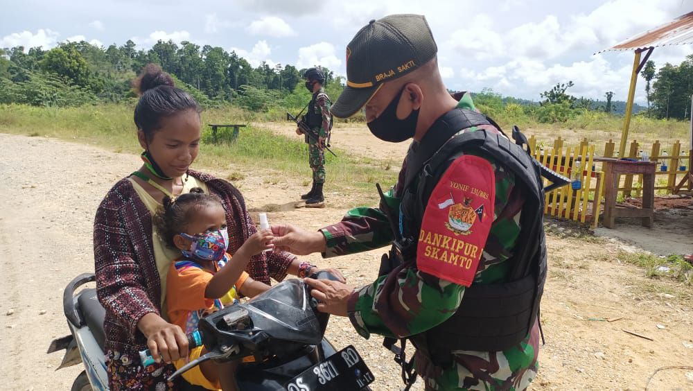 Keerom – Mencegah semangkin bertambahnya kasus corona atau covid-19 anggota TNI Satgas Pamtas RI-PNG Yonif 131/Brs Pos Skamto membagikan masker dan handsanitizer kepada masyarakat kampung Yowong dan Arso Distrik Keroom.