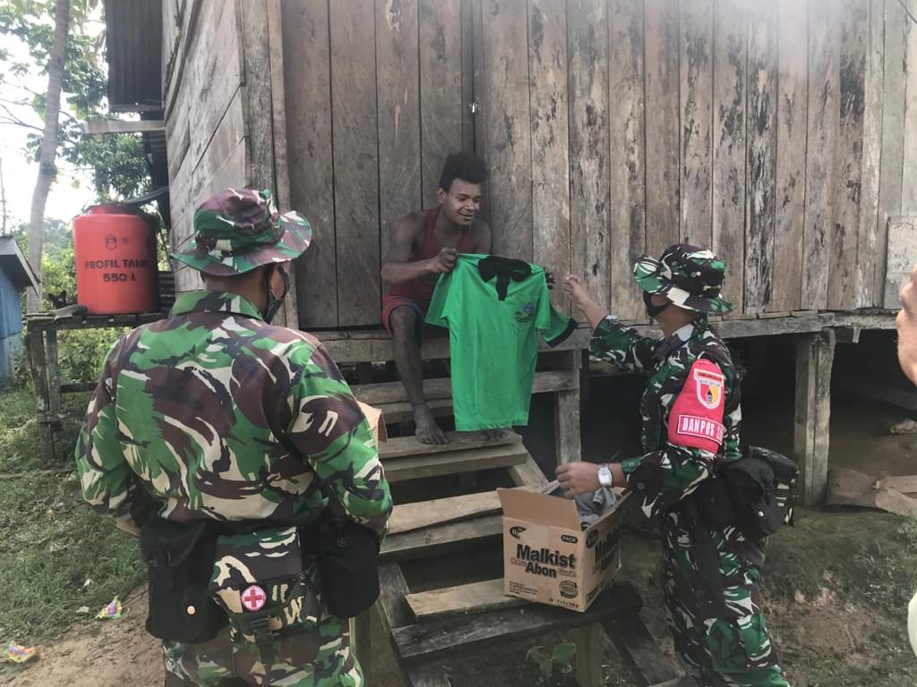 Keerom – Sebagai wujud kepedulian dan kecintaan terhadap warga binaan, anggota Pos Yabanda Satgas Pamtas RI-PNG Yonif Mekanis 512/QY memberikan bantuan berupa pakaian kepada warga Kampung Yabanda, Distrik Yaffi, Kabupaten Keerom papua. Senin (14/06/2021)