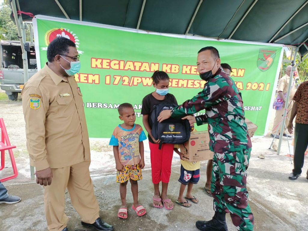 Kegiatan yang dihadiri sebanyak 150 orang tersebut, turut dilaksanakan vaksinasi Covid-19, pemberian bantuan makanan tambahan dari PT. Kalbe Farma serta pemberian bantuan dari Korem 172/PWY berupa makanan tambahan bagi balita dan ibu hamil, Perlengkapan sekolah dan Alkitab untuk gereja setempat.