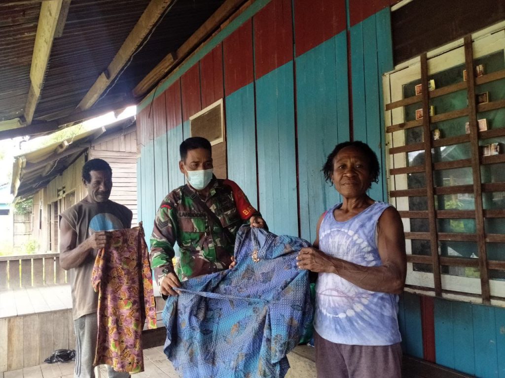 Unurum Guay – Babinsa Koramil 1701-16/Unurum Guay Serka Lahuddin melaksanakan Komsos di rumah Bapak Yowel Sasbe dan memberikan taliasi berupa beras dan pakaian untuk di pakai ibadah mingguan sebagai bentuk perhatian antara babinsa dengan Warga Binaan di Kampung Santosa Distrik Unurum Guay Kabupaten Jayapura.Sabtu(17-6-2021)