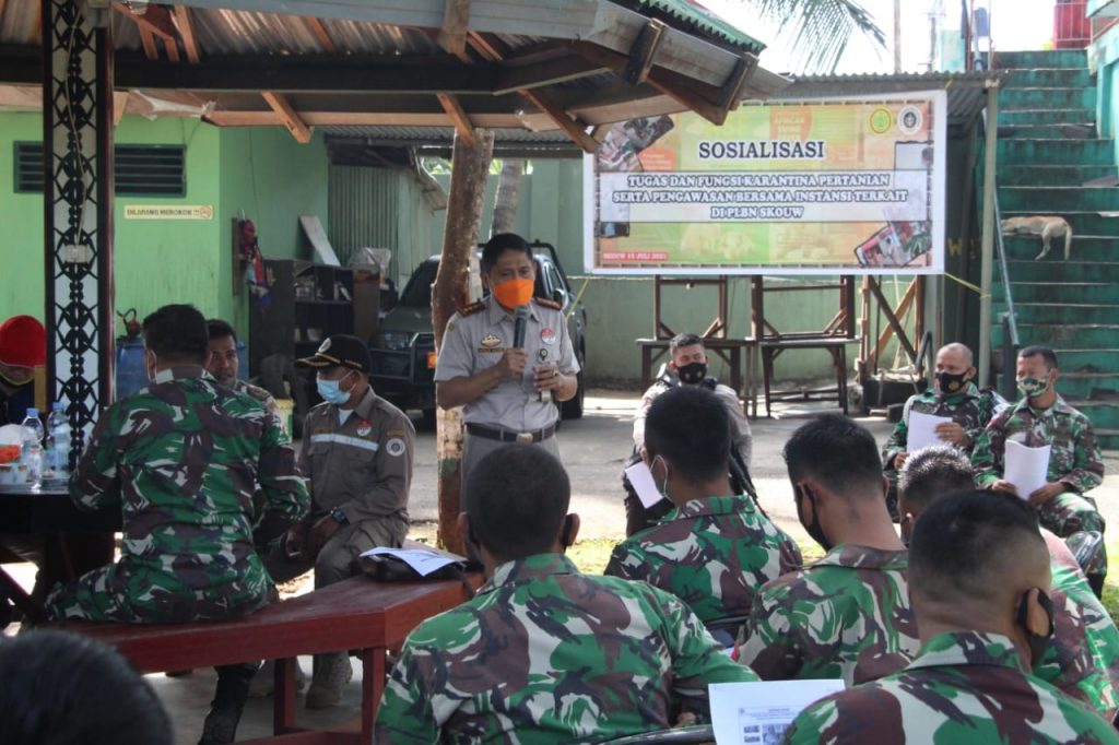 Skouw – Satgas Pamtas RI-PNG Yonif 131/Brs dan unsur CIQ’s PLBN Skouw menerima sosialisasi Kekarantinaan dari Kepala Karantina Kelas I Jayapura di perbatasan Skouw Distrik Muara Tami, Jayapura (16/07/2021).