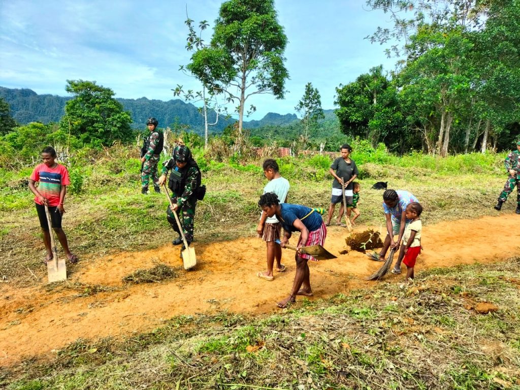 Keerom – Tingkatkan keakraban antara TNI dan warga di Perbatasan RI-PNG, Satgas Pamtas RI-PNG Yonif 126/KC bantu warga membersihkan jalan di Kampung Somografi, Distrik Web, Kabupaten Keerom, Papua.