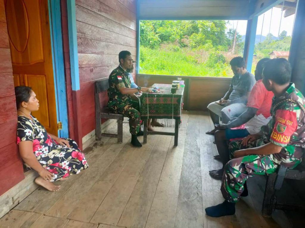 Jayapura – Gencar lakukan pendekatan bersama masyarakat, Babinsa Koramil 1701-13/Kaurah Sertu Majid Oli dan 9 (sembilan) anggota lainnya melaksanakan legiatan komunikasi sosial (komsos) dan anjangsana di salah satu rumah warga binaan Kepala Kampung Sisik Bapak Yance Masita, di Kampung Sisik, Distrik Kaureh, Kabupaten Jayapura, Kamis (27/1/2022).