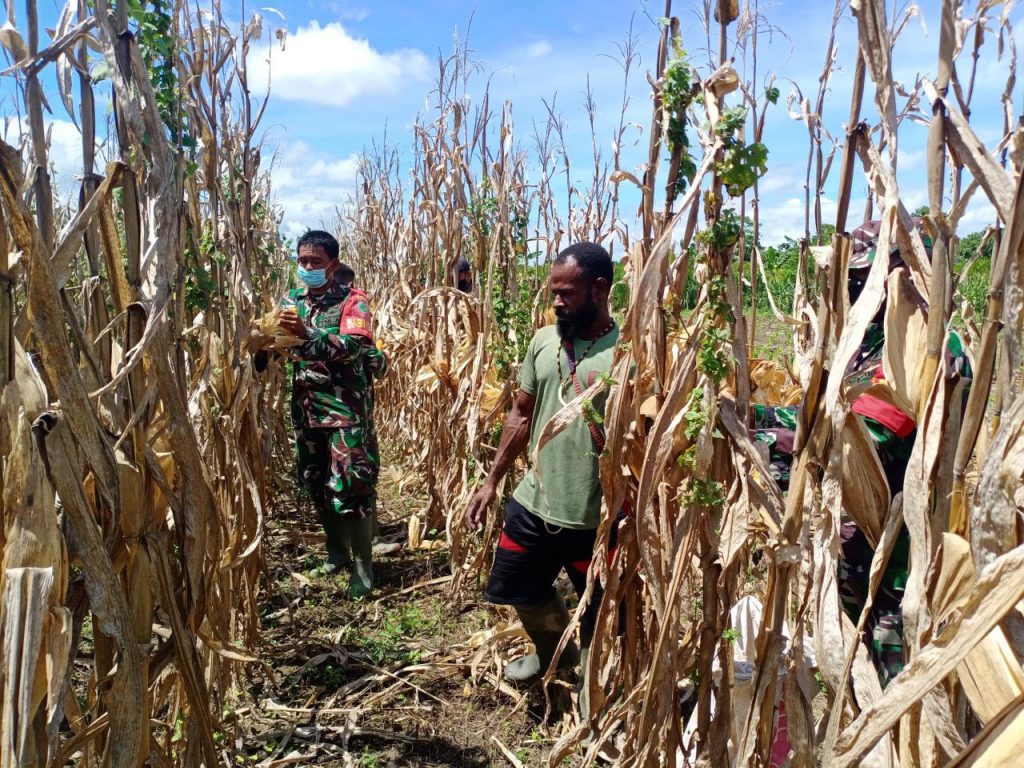 Keerom – Kepedulian TNI kepada rakyatnya, melalui 10 (sepuluh) orang anggota Babinsa Koramil 1701-23/Skanto di bawah pimpinan Sertu Armin melaksanakan pendampingan kepada para petani Bapak Yustinus (46) yang sedang panen jagung dengan luas tanam 1/2 H di Kampung Intaimelyan, Distrik Skanto, Kabupaten Keerom, kamis (20/1/2022).