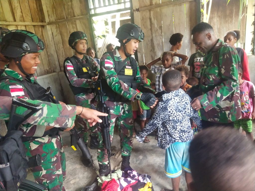 Keerom – Prajurit Satgas Yonif 126/KC bagikan pakaian layak pakai kepada warga di wilayah perbatasan RI-PNG Kampung Monogoefi, Distrik KM 140, Kabupaten Keerom, Papua.