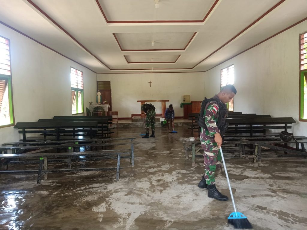 Keerom – Personel Pos Sawiyatami Satgas Pamtas RI-PNG Yonif 711/Rks bersama warga membersihkan Gereja Sawiyatami dan memberikan bantuan berupa Alkitab, di Kampung Sawiyatami, Distrik Arso Timur, Kab. Keerom, Jayapura Jumat (21/01/2022).
