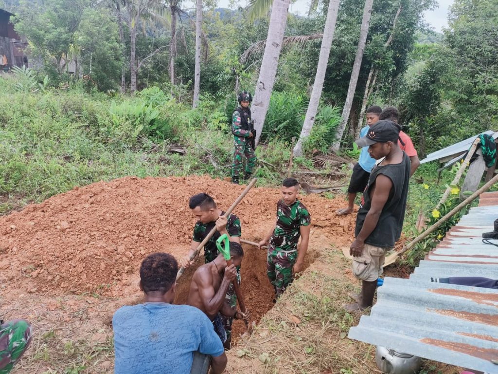 Keerom- Sebagai bentuk kepedulian dan rasa empati terhadap sesama, Satgas Yonif 126/Kala Cakti membantu proses pemakaman almarhum Yan Fopay yang meninggal karena sakit di Kampung Yuruf, Distrik Yaffi, Kabupaten Keerom, Papua.