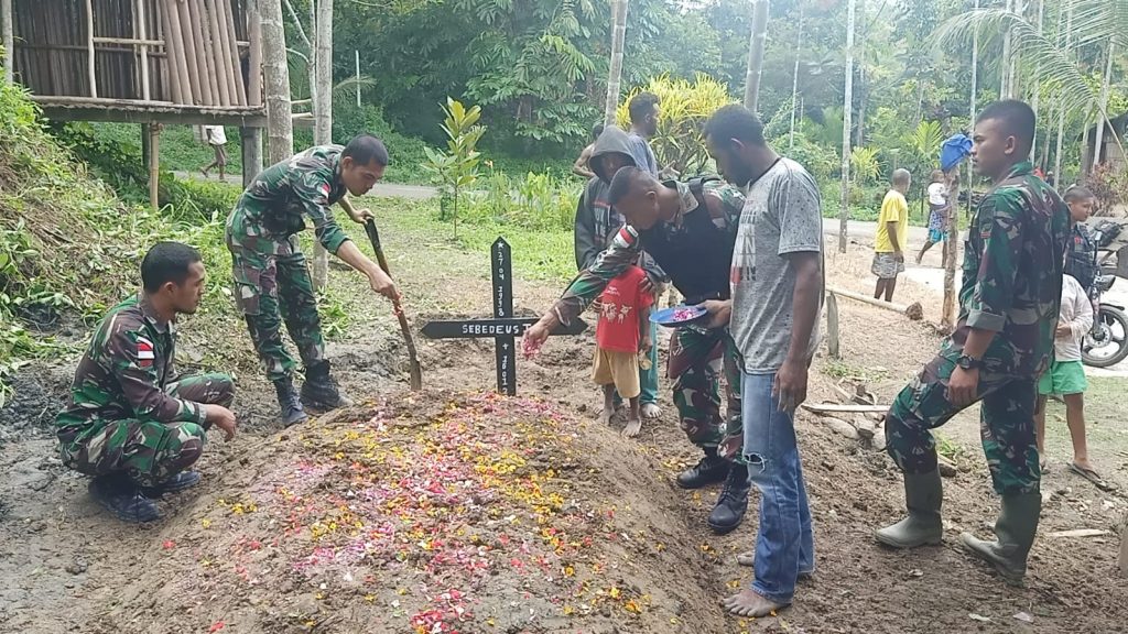 Keerom-Prajurit Satgas Pamtas RI-PNG Yonif 126/KC membantu proses pemakaman salah satu warga meninggal dunia karena sakit di Kampung Sach, Distrik Waris, Kabupaten Keerom.