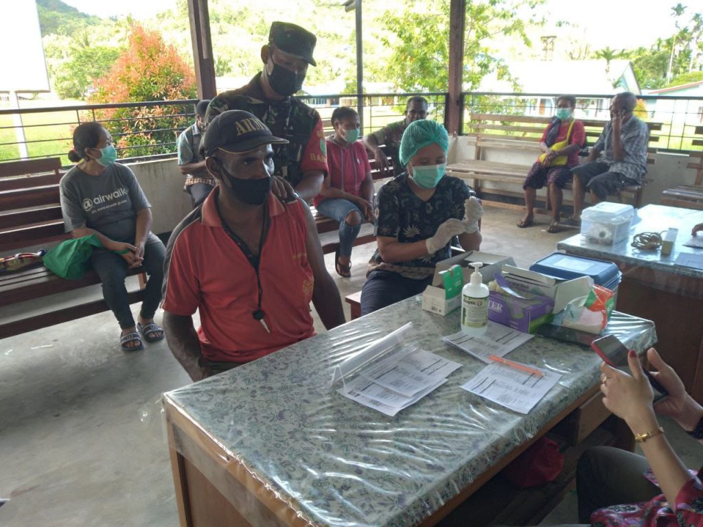 Jayapura – Dalam rangka mensukseskan program pemerintah, Anggota Koramil 1701-10/Depapre berjumlah 10 (sepuluh) orang di bawah pimpin Serma Suwito melaksanakan pengamanan dan pemantauan kegiatan Vaksinasi Nasional Covid-19 di Puskesmas Depapre kepada masyarakat yang terdiri dari 8 (delapan) kampung di wilayah Distrik Depapre, Kabupaten Jayapura, selasa (18/1/2022).