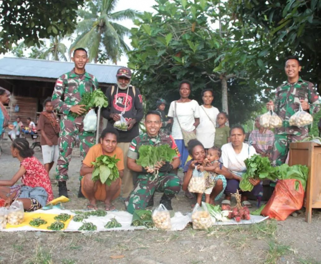 Personel Satgas Pamtas RI-PNG Yonif 126/KC Pos Kout yang dipimpin oleh Wadan Satgas Mayor Inf Wahidin Sobar, S.Sos. membantu meningkatkan perekonomian masyarakat Perbatasan Papua dengan membeli hasil kebun masyarakat yang dijual di lapak-lapak sementara bertempat di Kp. Pund Dusun Dawa, Distrik Waris Kab. Keerom
