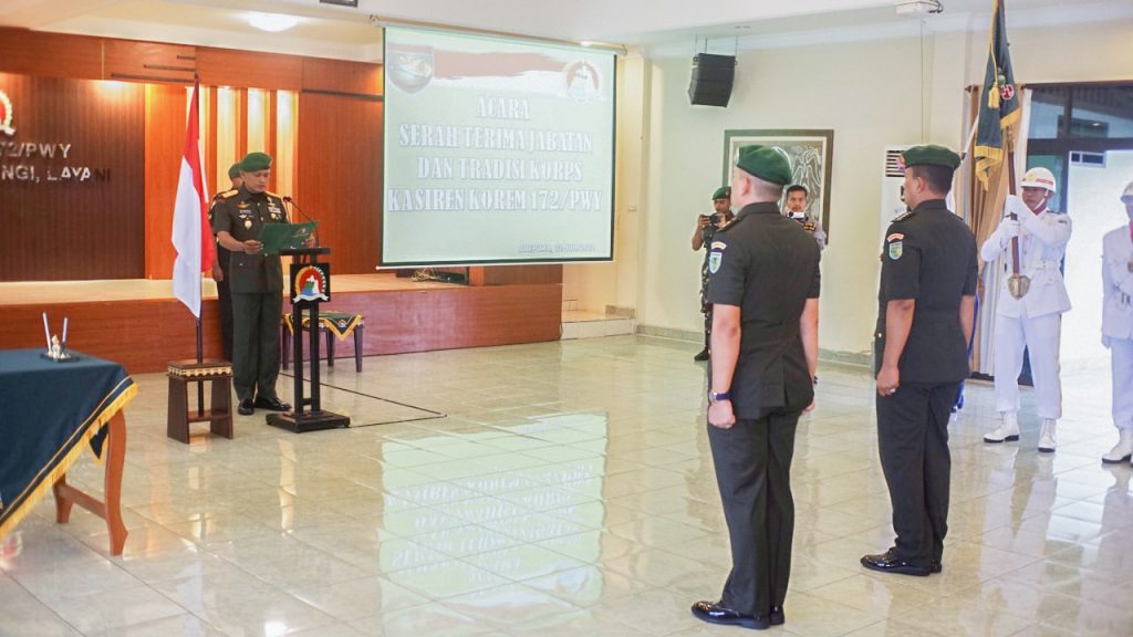 Jayapura – Komandan Korem 172/PWY Brigjen TNI J.O Sembiring memimpin Serah Terima Jabatan Kepala Seksi Perencanaan (Kasiren) Korem 172/PWY dari Kolonel Arm Andi Martopo kepada Letkol Inf Educ Permadi Eko, bertempat di Aula Makorem 172/PWY, Jum’at (22/7).
