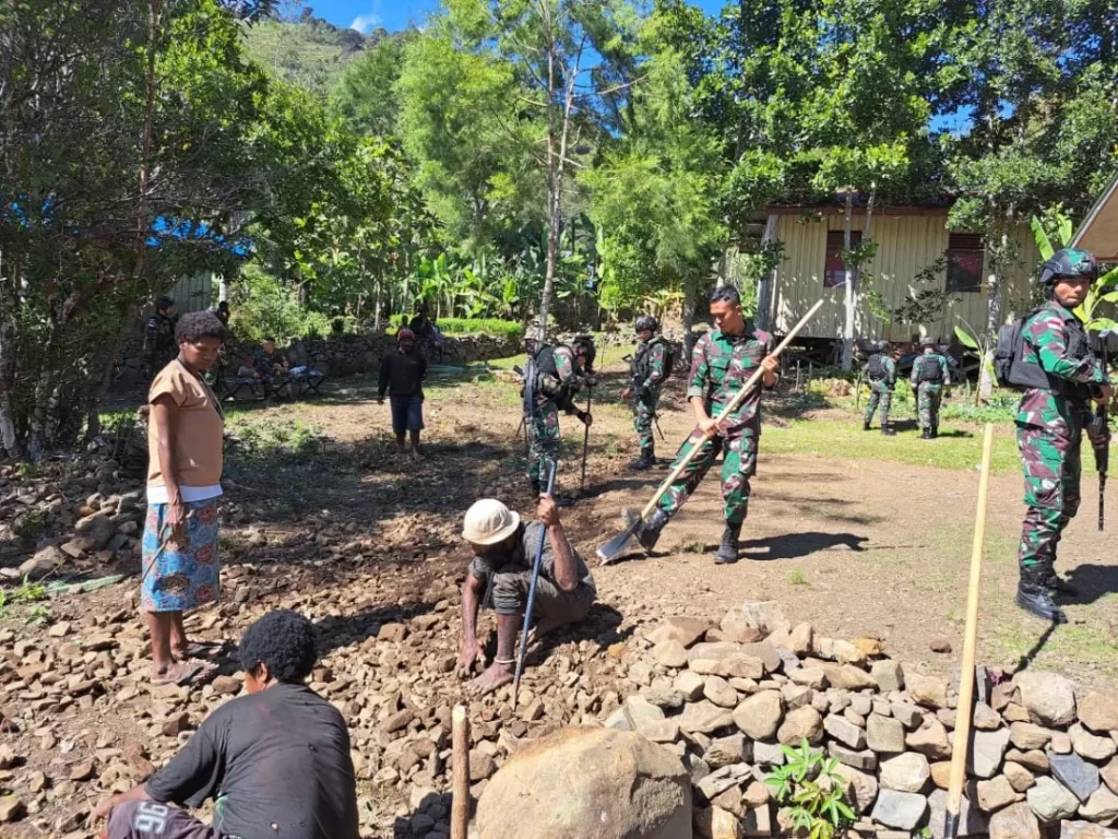 Tolikara ~ Kedekatan warga dan Satgas Pamtas Yonif Raider 142/KJ Pos Kanggime dapat terllihat melalui kegiatan gotong Royong peluasan jalan Nangka di Distrik Kanggime, Kab Tolikara, Papua, Rabu (27/07/2022).