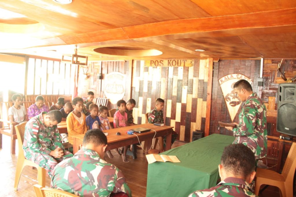 Personel Pos Kout Satgas Yonif 126/KC mengajak ibadah masyarakat di Pos Kout, Distrik Waris, Kabupaten Keerom.