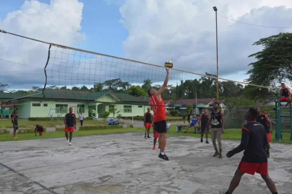Senggi – Komandan Korem 172/PWY Brigjen TNI J.O Sembiring saat melaksanakan kunjungan kerja ke Kompi C Yonif 756/WMS, menyempatkan waktu untuk berolahraga dengan bermain voli bersama anggota di Markas Kompi C Yonif 756/WMS, Distrik Senggi, Kab. Keerom, Rabu (28/7).