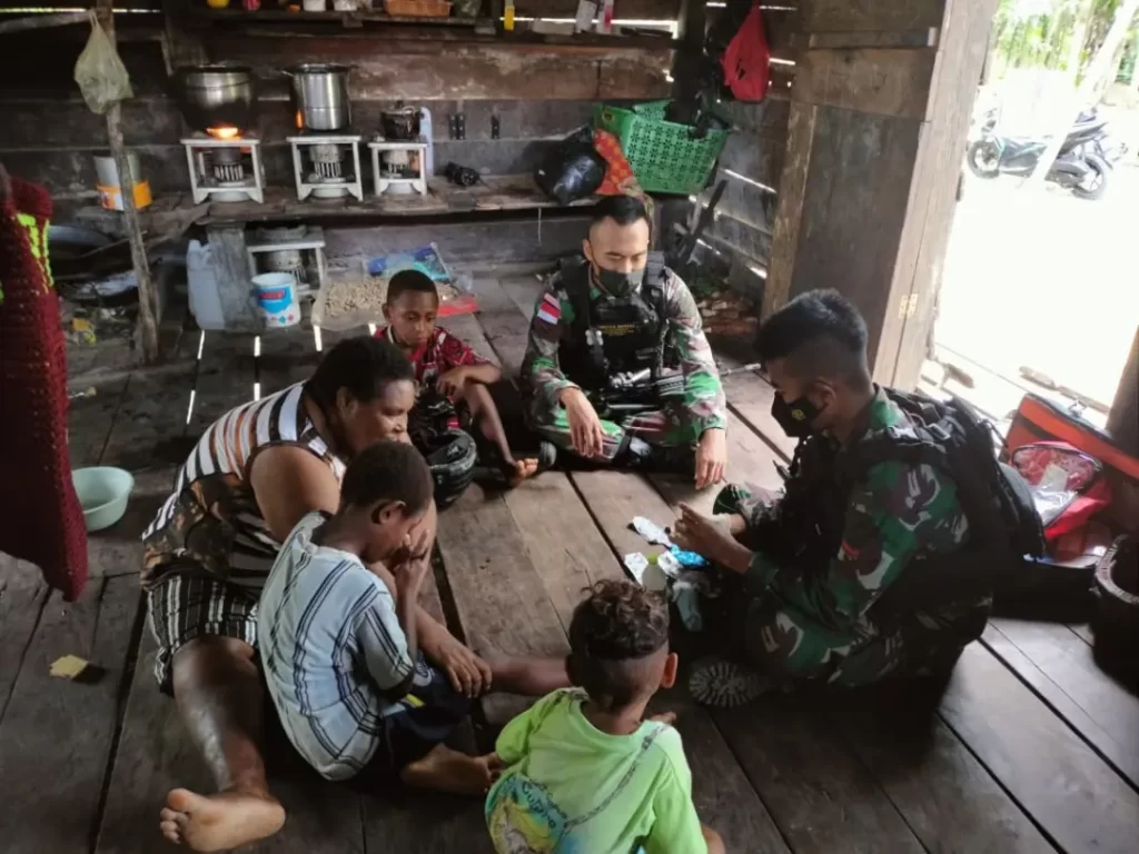 Kepedulian anggota Satgas Pamtas RI-PNG Yonif 711/Rks Pos Wambes kepada warga Papua dengan mendatangi dari rumah ke rumah memberikan pelayanan kesehatan pengobatan gratis, bertempat di Kampung Wambes, Distrik Arso Timur, Kabupaten Keerom, Papua, Senin (18/7/2022).