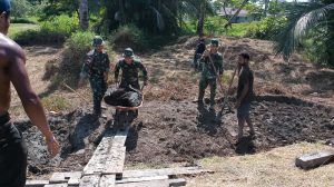 Satgas Yonif 126/KC Pos Batom bersama warga melaksanakan Karya Bakti perbaikan jalan rusak menuju sawah di Kampung Batom, Distrik Batom,...