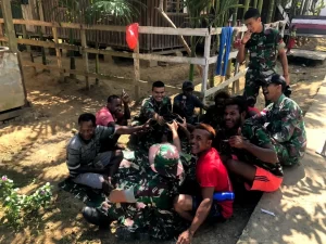Prajurit TNI Satgas Pamtas RI-PNG Yonif 711/Rks Brigif 22/OM Pos Kout Pir IV membagikan baju merah putih dan layak pakai...