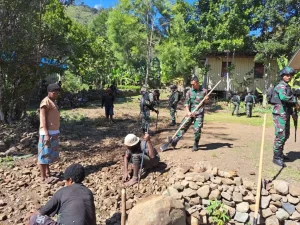 Tolikara ~ Kedekatan warga dan Satgas Pamtas Yonif Raider 142/KJ Pos Kanggime dapat terllihat melalui kegiatan gotong Royong peluasan jalan...