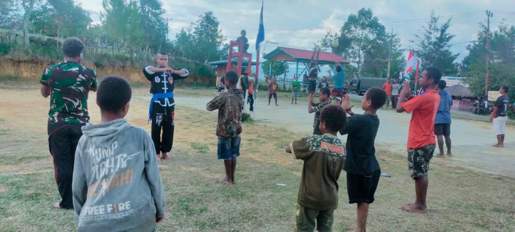 Ajarkan Seni Bela Diri sejak dini anggota Pos Napua Satgas Satuan Organik Yonif Raider 321/GT memberikan latihan seni bela diri Pencak Silat dalam rangka membentuk mental kepribadian generasi muda Indonesia kepada Pemuda Pemudi Distrik Napua, Kabupaten Nduga, Provinsi Papua, Senin (09/07/2022)