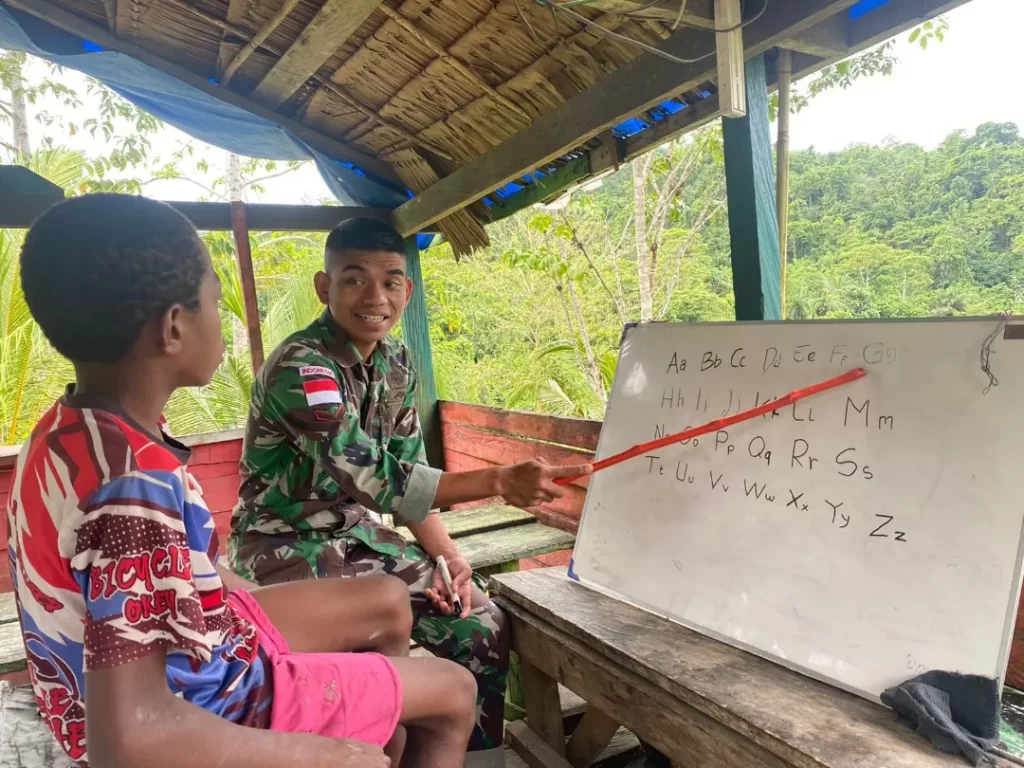 Pengabdian yang luar biasa, terus dilakukan Satgas Pamtas RI-PNG Yonif 711/Rks Brigif 22/OM Pos Sawiyatami untuk meningkatkan pendidikan di perbatasan RI PNG dalam membantu mengajar Anak-anak di Kampung Sawiyatami, Distrik Arso Timur, Kabupaten Keerom, Papua, Sabtu (30/7/2022).