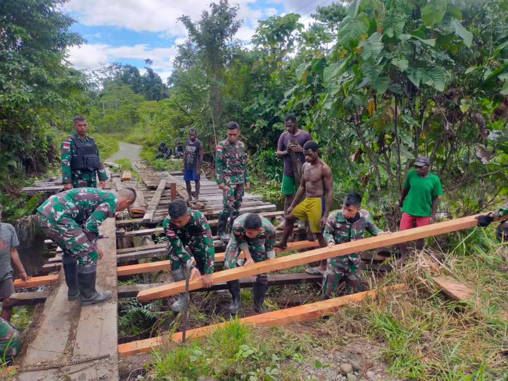 Yahukimo ~ Bentuk kepedulian Satgas Pamtas Yonif Raider 142/KJ terhadap lingkungan dan pembangunan di Papua, salah satunya yaitu bergotong royong bersama masyarakat memperbaiki Jembatan yang rusak, yaitu jembatan kali Bruto yang menghubungkan antara Kampung Kekey dengan Kampung Maruku yang mengarah ke Kota Dekat, di Distrik Kekey, Kab. Yahukimo, Rabu (06/07/2022)