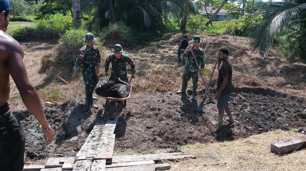 Satgas Yonif 126/KC Pos Batom bersama warga melaksanakan Karya Bakti perbaikan jalan rusak menuju sawah di Kampung Batom, Distrik Batom, Kabupaten Pegunungan Bintang.