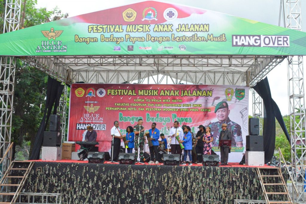 Jayapura – Festival Musik Anak Jalanan (FMAJ) secara resmi dibuka oleh Danrem 172/PWY Brigjen TNI J.O Sembiring, didampingi Wakil Rektor IV Uncen, Dekan FKIP Uncen yang ditandai dengan penabuhan Tifa di Lapangan Parkir Auditorium Uncen, Abepura, Kota Jayapura, Rabu (20/7).