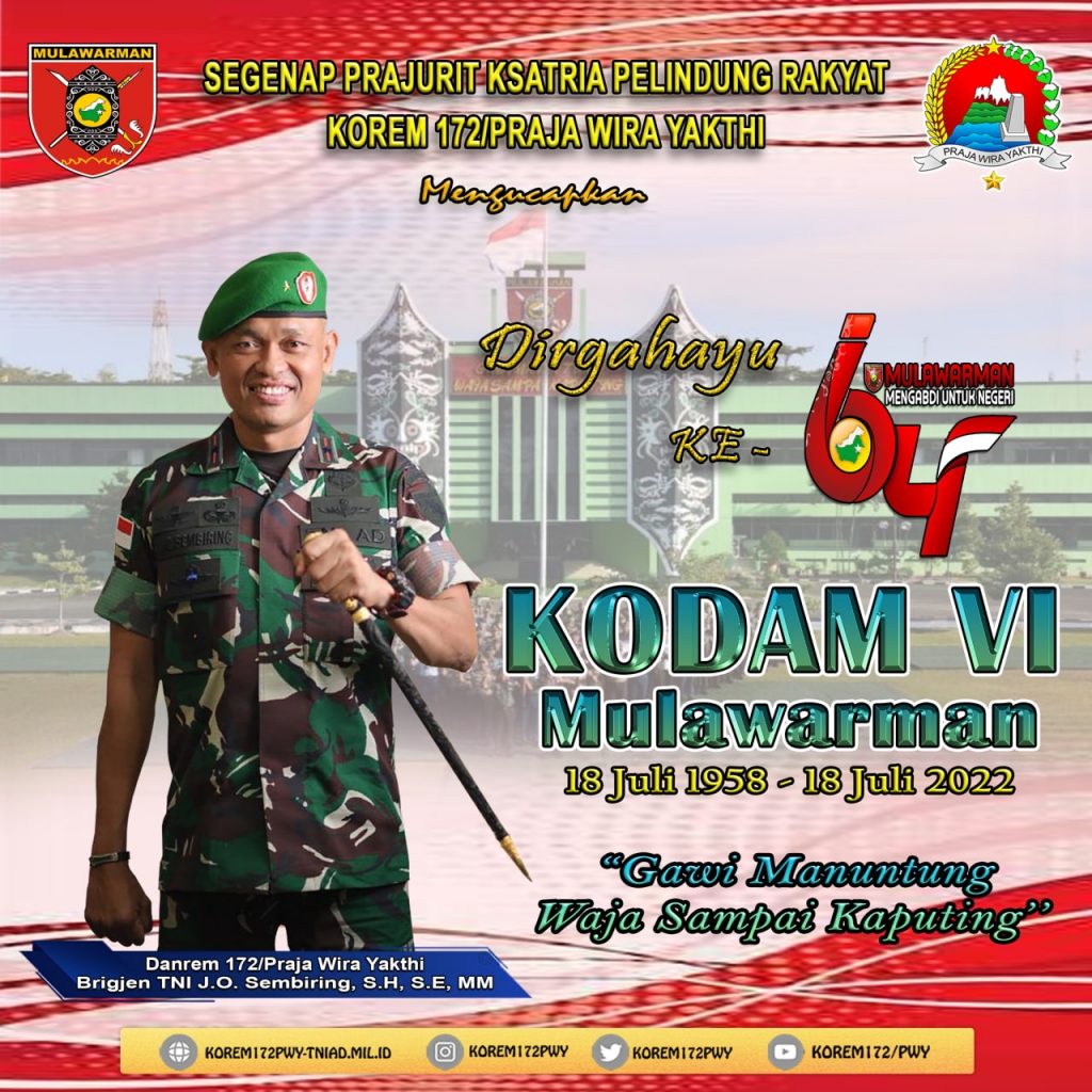 SEGENAP PRAJURIT KSATRIA PELINDUNG RAKYAT KOREM 172/PRAJA WIRA YAKTHI MENGUCAPKAN DIRGAHAYU KE – 64 KODAM VI / MULAWARMAN 18 JULI 1958 – 18 JULI 2022 ” GAWI MANUNTUNG WAJA SAMPAI KAPUTING”