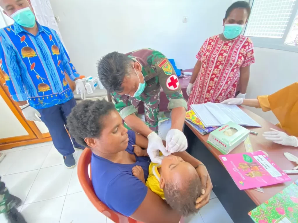 Mamberamo Tengah ~ Kepedulian terhadap kesehatan dan pertumbuhan anak-anak di Papua, Satgas Pamtas Yonif Raider 142/KJ bersama dengan Puskemas Kelila melaksanakan pemberian imunisasi rutin, bertempat di Puskesmas Kelila, Distrik Mamberamo Tengah, Papua, Senin (25/07/2022)