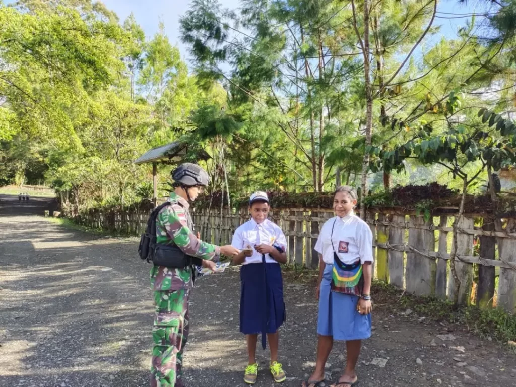 Satgas Pamtas RI-PNG Yonif Raider 142/KJ melalui Pos Kelila membagikan buku tulis dan pena kepada setiap siswa yang melintas di depan Pos Satgas di Distrik Kelila, Kabupaten, Mamberamo Tengah, Papua, Sabtu (23/07/2022).