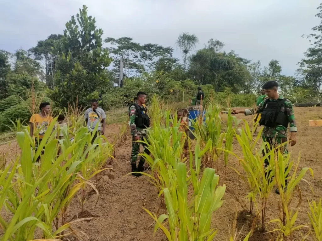 Dalam membantu meningkatkan ketahanan pangan di Wilayah perbatasan Papua Pos KM 140 Satgas Yonif 126/KC bersama masyarakat menyiram dan memupuk tanaman yang ada di Kampung Monggoefi, Kab. Keerom.