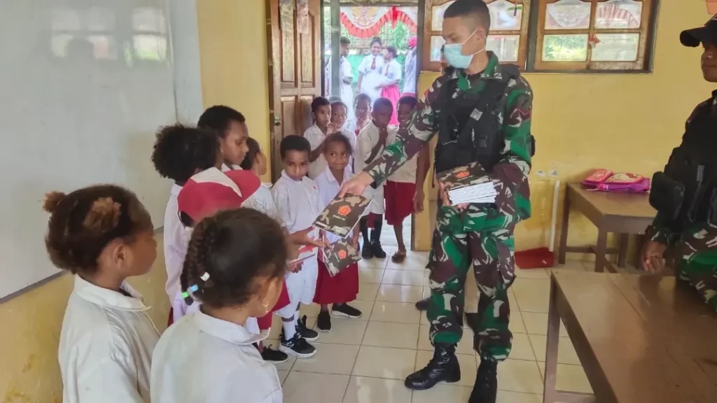 Untuk itu, Satgas Pamtas RI-PNG Yonif 711/Rks Brigif 22/OM Pos Muara Tami terus berupaya berkontribusi memberikan semangat dan motivasi kepada anak-anak sekolah dasar di Papua. Dengan cara memberikan bantuan tas dan buku tulis kepada siswa-siswi SD Skouw Sae, di Kampung Skouw Sae, Distrik Muara Tami, Kota Jayapura, Papua. Kamis (11/08/2022).
