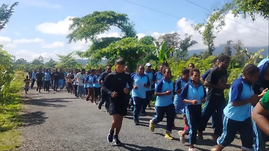 Terlihat TNI dan para siswa lari-lari kecil santai, menikmati udara pagi wilayah Kampung Elelim yang segar. Bahkan keceriaan tergambar saat bernyanyi bersama disela olahraga pagi.