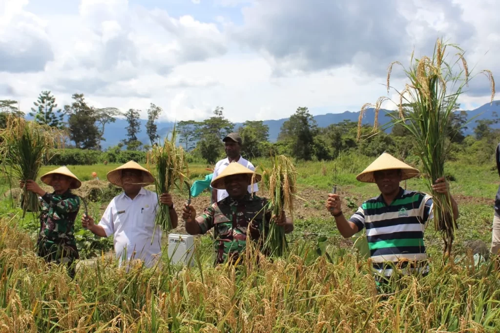Wamena – Dandim 1702/Jayawijaya Letkol Cpn Athenius Murip, SH,MH menghadiri syukuran Panen Padi Perdana di tanah Misi di lokasi Persawahan Paroki-Kimbim Jl. Lintas Wamena – Tiom Distrik Assologaima Kab. Jayawijaya (24/08/2022).