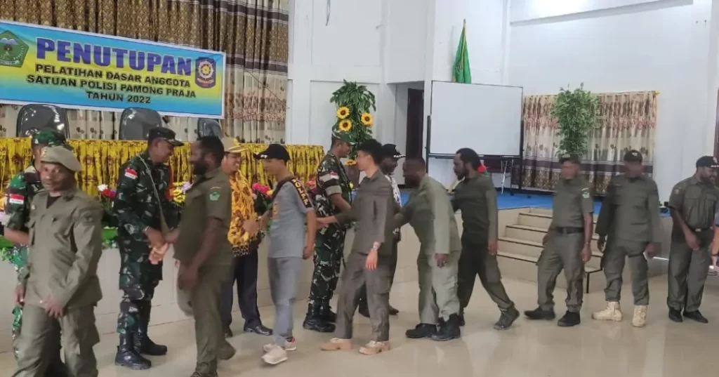 Kenyam – Dalam rangka mendukung program pemerintah di bidang ketertiban dan keamanan, Dandim 1715/Yahukimo Letkol Inf Johanis Victorianus Tethool menghadiri serta menutup pelatihan dasar anggota Satuan Polisi Pamong Praja (Satpol PP) Kabupaten Nduga di Gedung Pertemuan Kegayam, Distrik Kenyam, Kabupaten Nduga, Provinsi Papua Pegunungan, Kamis (25/8)