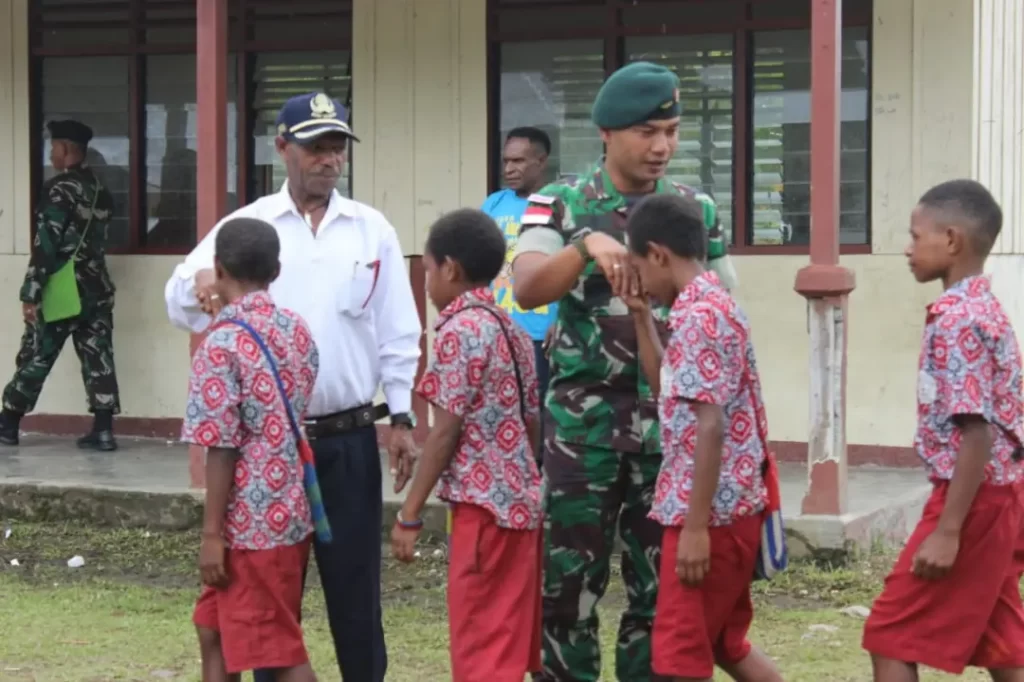 Elelim, Yalimo ~ Kedekatan tanpa mengenal siapapun, hal inilah yang dilakukan oleh Dansatgas Pamtas Yonif Raider 142/KJ Letkol Inf Esnan Haryadi ketika berkunjung ke Sekolah Dasar Inpres Elelim, Distrik Elelim, Kabupaten Yalimo, Pegunungan Tengah Papua, Rabu (10/08/2022)
