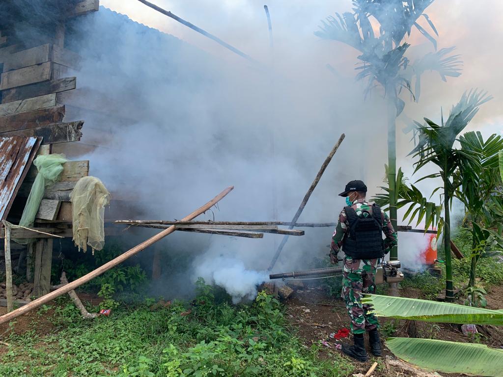Upaya menghindari dan mencegah berkembangnya nyamuk yang dapat menyebabkan Malaria, Satgas Yonif 126/KC Pos Yurub melaksanakan Fogging di Kampung Yuruf, Distrik Yaffi, Kabupaten Keerom.