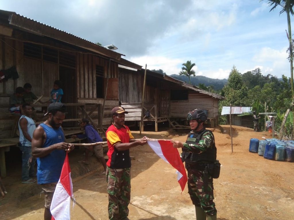 Jelang Hari Ulang Tahun (HUT) Proklamasi Kemerdekaan RI ke 77 tanggal 17 Agustus 2022, personel Satgas Yonif 126/KC Pos Somografi menggelar pengibaran bendera Merah Putih di Kampung Somografi, Distrik Web Kab. Keerom.