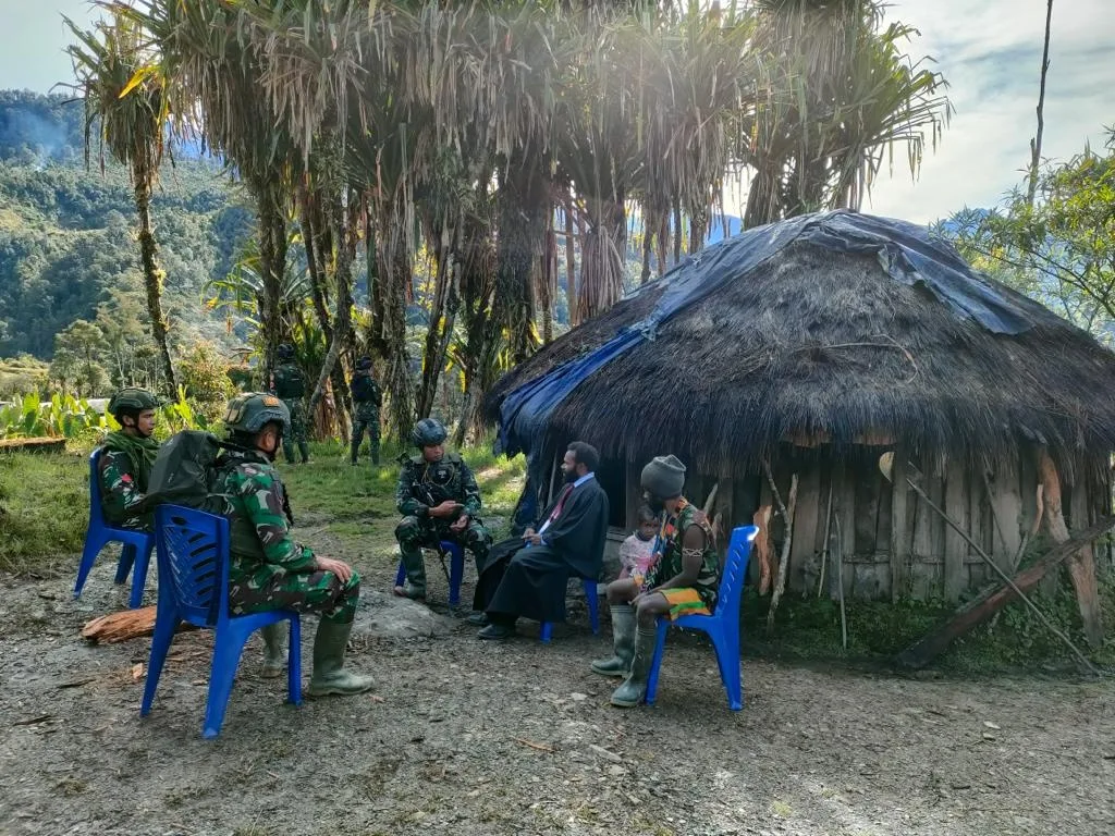 Dalam rangka memperkokoh kemanunggalan antara TNI dengan Rakyat, Personel Pos Dal Satgas Yonif Raider 321/GT/13/1 Kostrad melaksanakan komunikasi sosial (Komsos) dengan mengunjungi honai-honai warga masyarakat di Kampung Dal, Distrik Dal, Kabupaten Nduga, Papua (26/08/2022).
