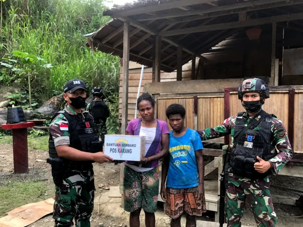 Dalam menyambut HUT RI Ke-77 Tahun, personel Satgas Yonif 126/KC Pos Karang bagikan bendera merah putih di kampung Karang, Distrik Yaffi Kab. Keerom. Sabtu (13/08/2022)